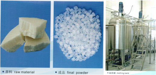 本设备主要用于聚乙烯腊、石蜡、胺基脂肪酸、甘油酸脂及橡胶塑料添加剂等熔融化学物料的喷雾冷却造粒,能满足客户对产品粒度的各种要求。